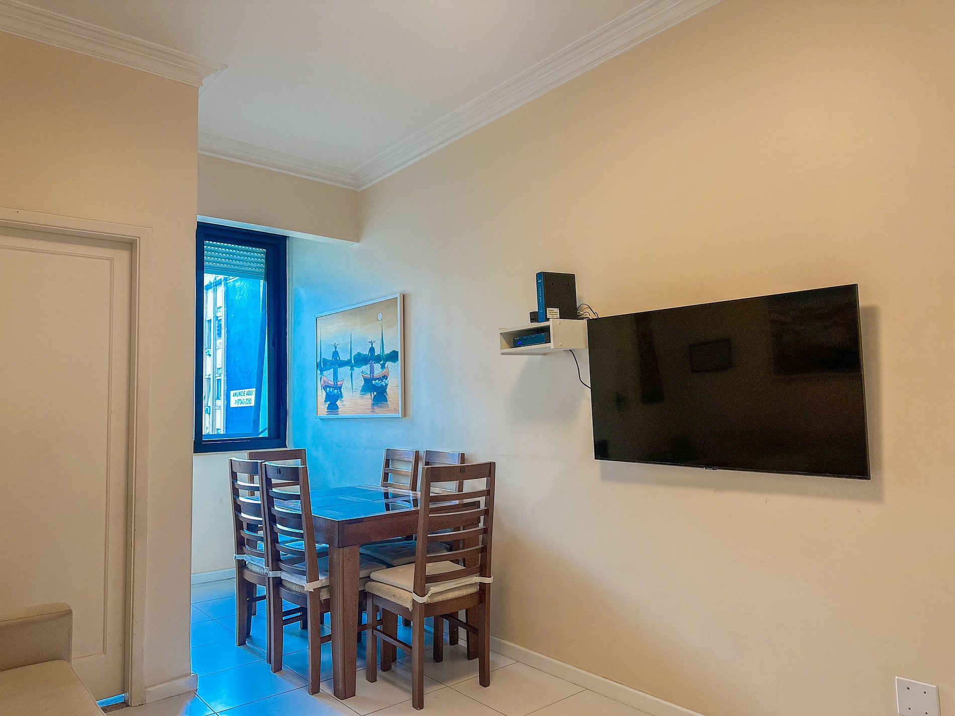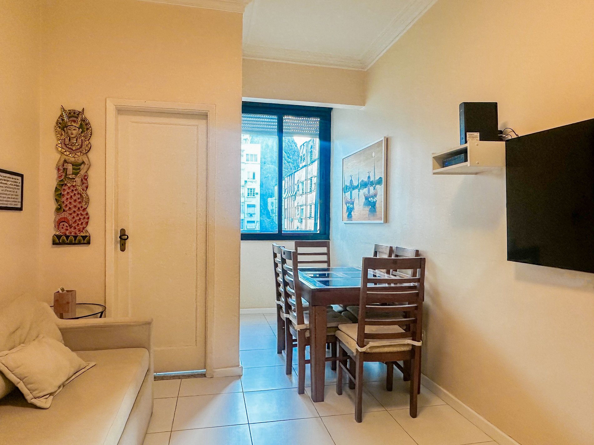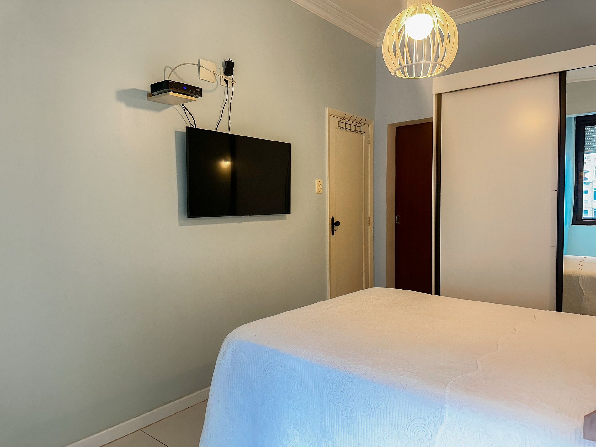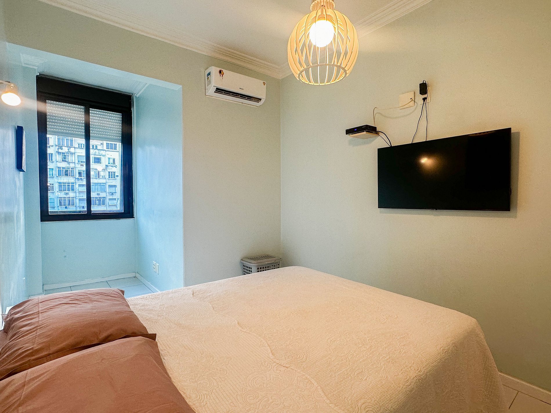 Tem capacidade para até 6 pessoas .Na sala, há uma TV Smart de 50’. No quarto, uma TV Smart de 43’. A sala também conta com uma mesa com 6 cadeiras e um sofá-cama de casal. A geladeira é nova e de inox.A cozinha está equipada com liquidificador, sanduicheira, cafeteira e utensílios para cozinhar. Todos os quartos e a sala possuem ar condicionado split, além de janelas acústicas antirruído e venezianas (blackout).O apartamento possui um banheiro social completo e uma suíte.