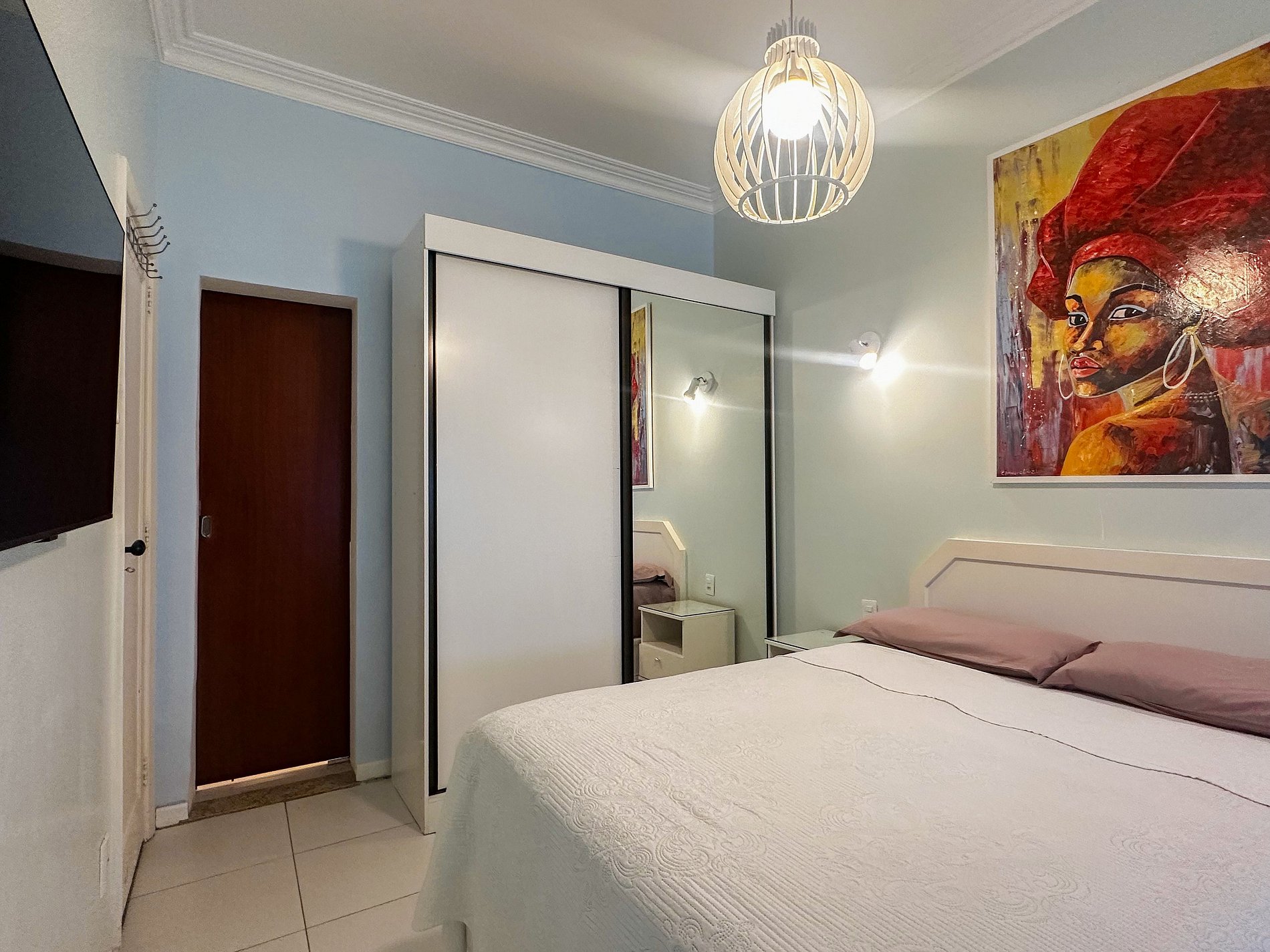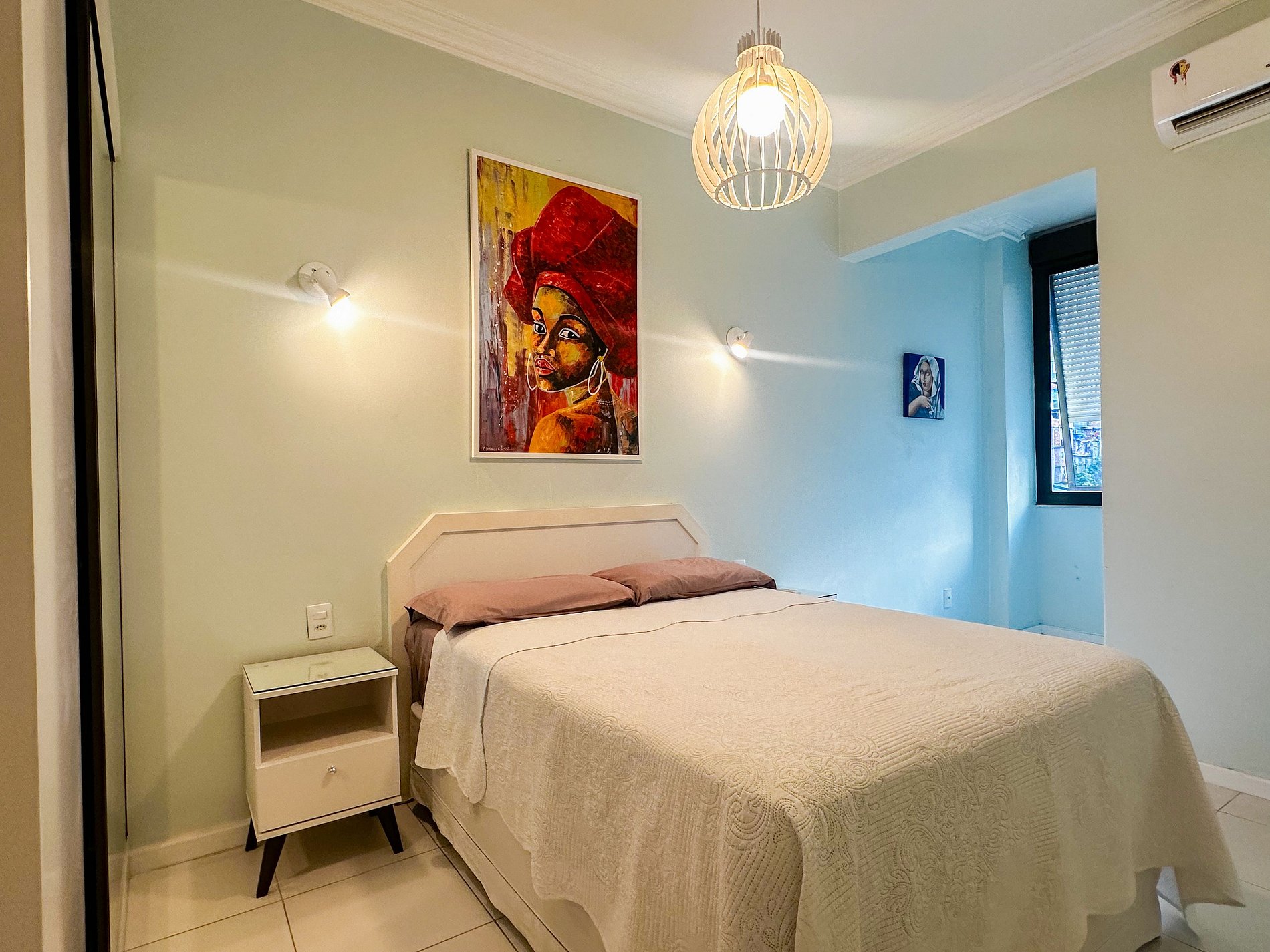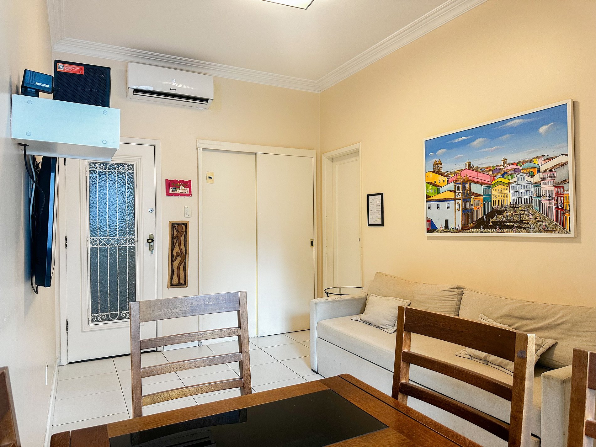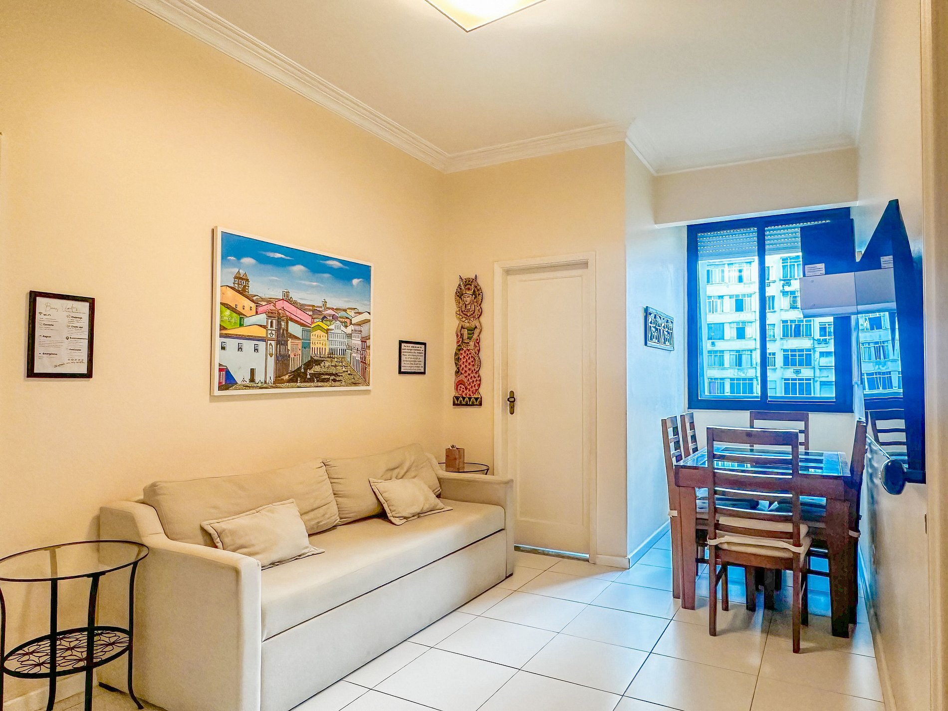 Tem capacidade para até 6 pessoas .Na sala, há uma TV Smart de 50’. No quarto, uma TV Smart de 43’. A sala também conta com uma mesa com 6 cadeiras e um sofá-cama de casal. A geladeira é nova e de inox.A cozinha está equipada com liquidificador, sanduicheira, cafeteira e utensílios para cozinhar. Todos os quartos e a sala possuem ar condicionado split, além de janelas acústicas antirruído e venezianas (blackout).O apartamento possui um banheiro social completo e uma suíte.