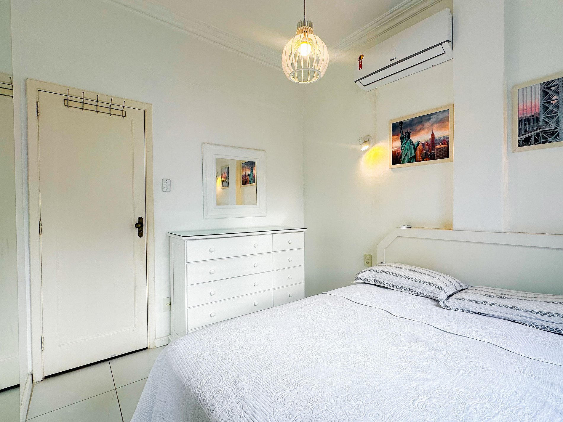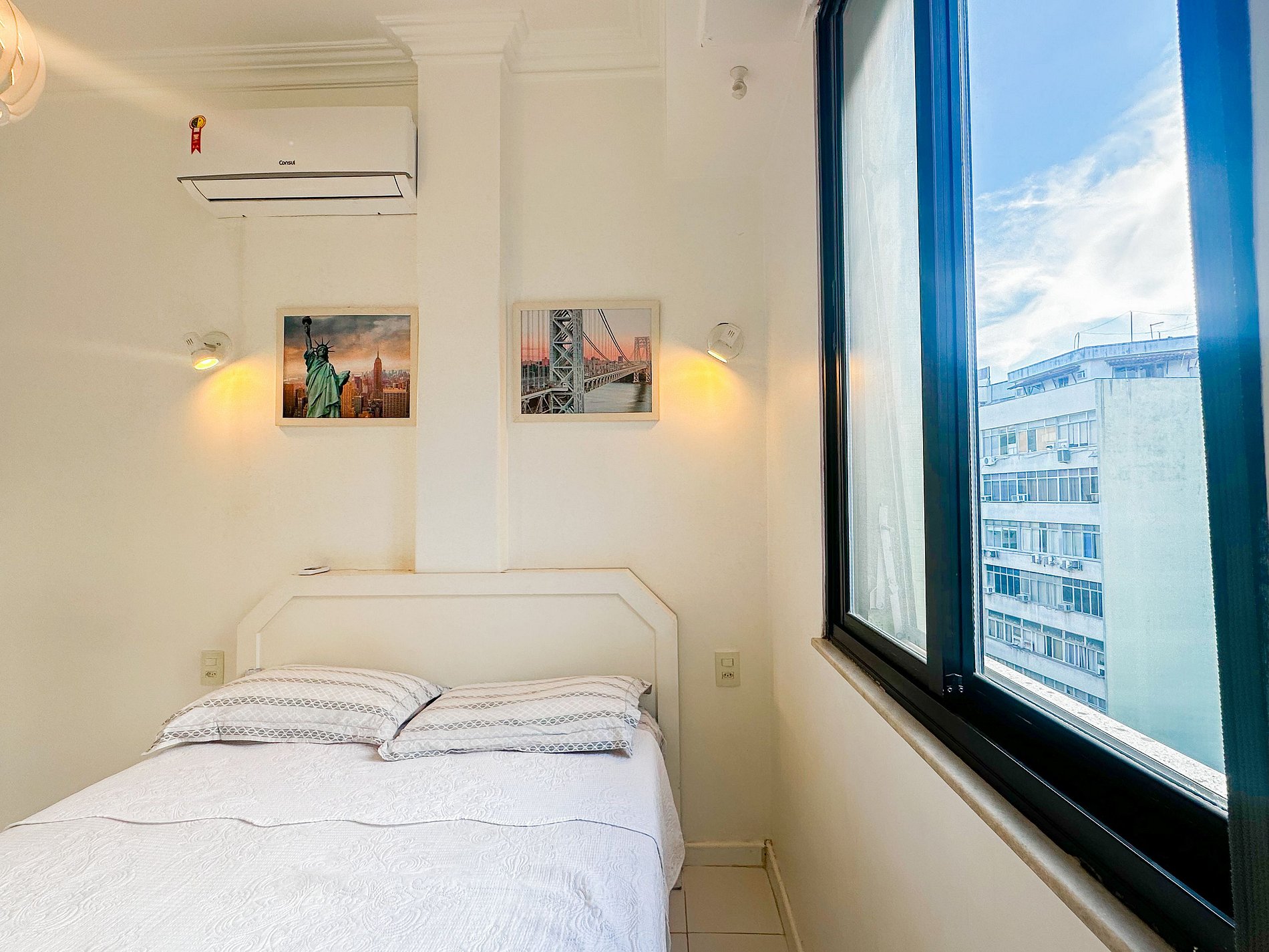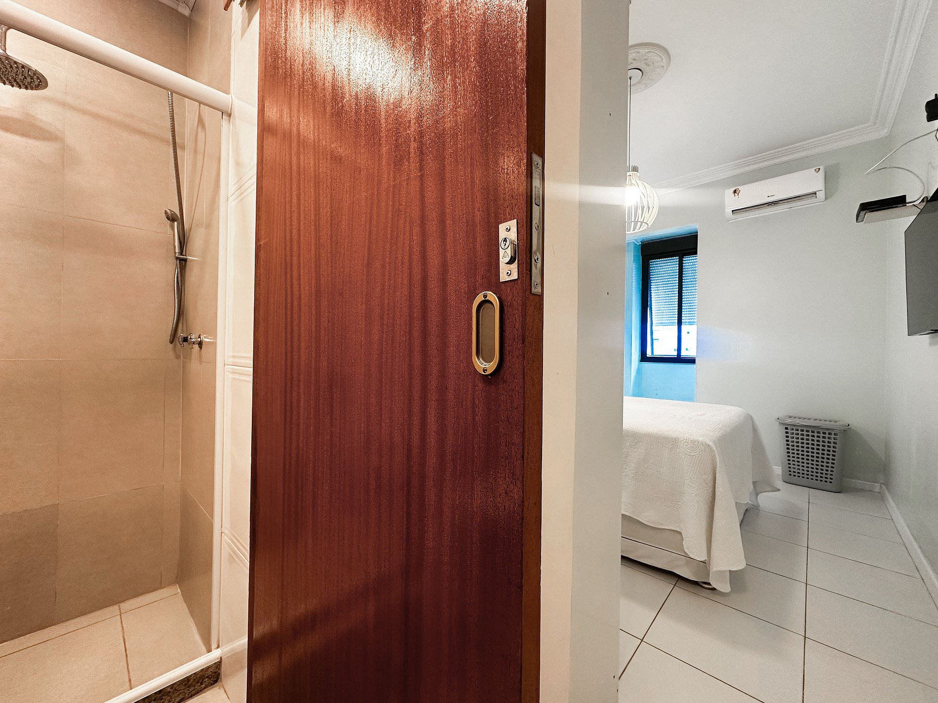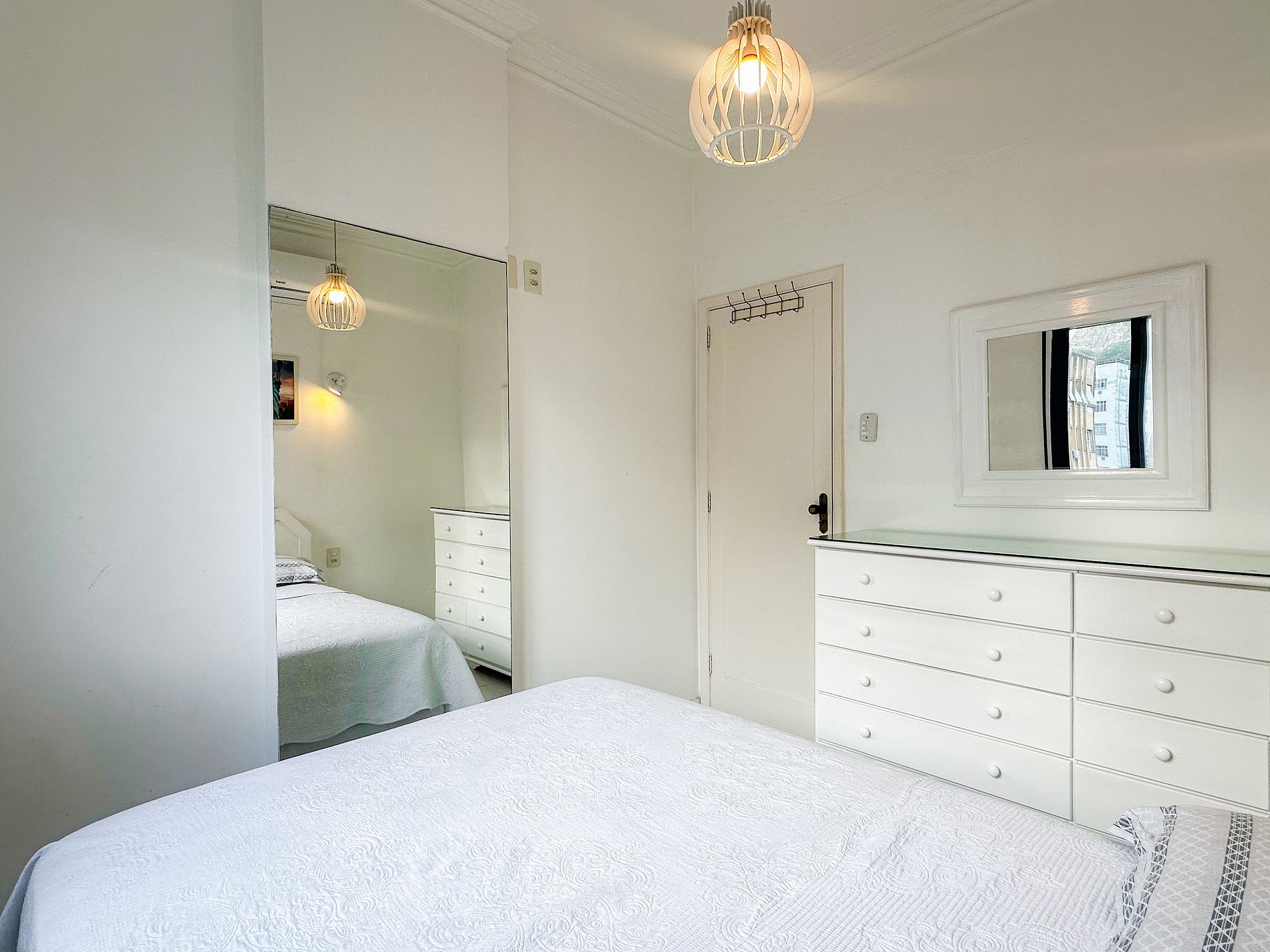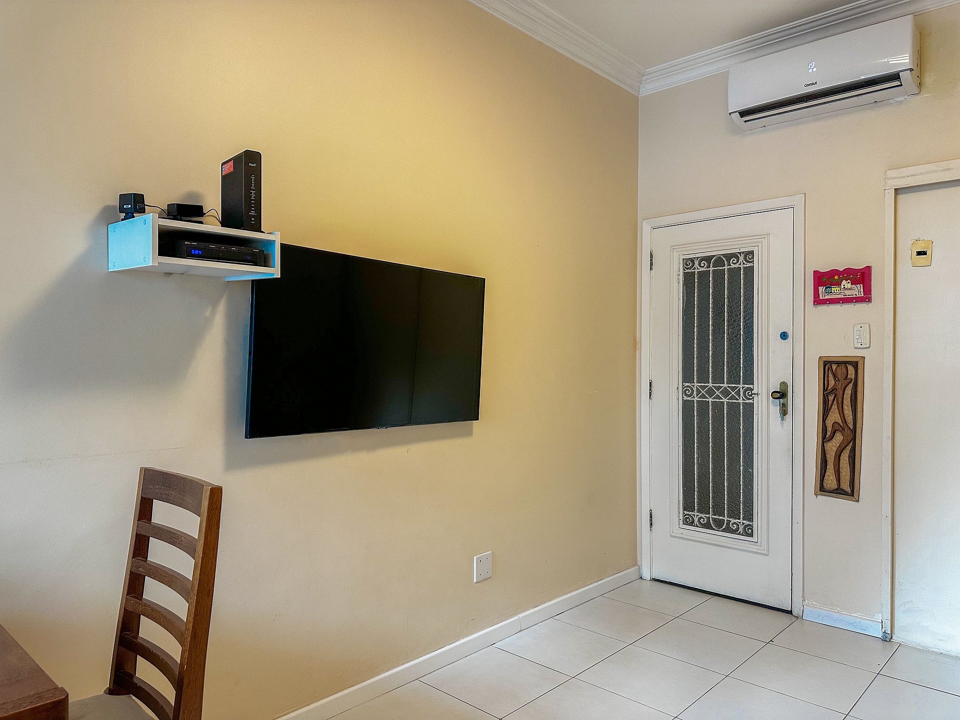 Tem capacidade para até 6 pessoas .Na sala, há uma TV Smart de 50’. No quarto, uma TV Smart de 43’. A sala também conta com uma mesa com 6 cadeiras e um sofá-cama de casal. A geladeira é nova e de inox.A cozinha está equipada com liquidificador, sanduicheira, cafeteira e utensílios para cozinhar. Todos os quartos e a sala possuem ar condicionado split, além de janelas acústicas antirruído e venezianas (blackout).O apartamento possui um banheiro social completo e uma suíte.