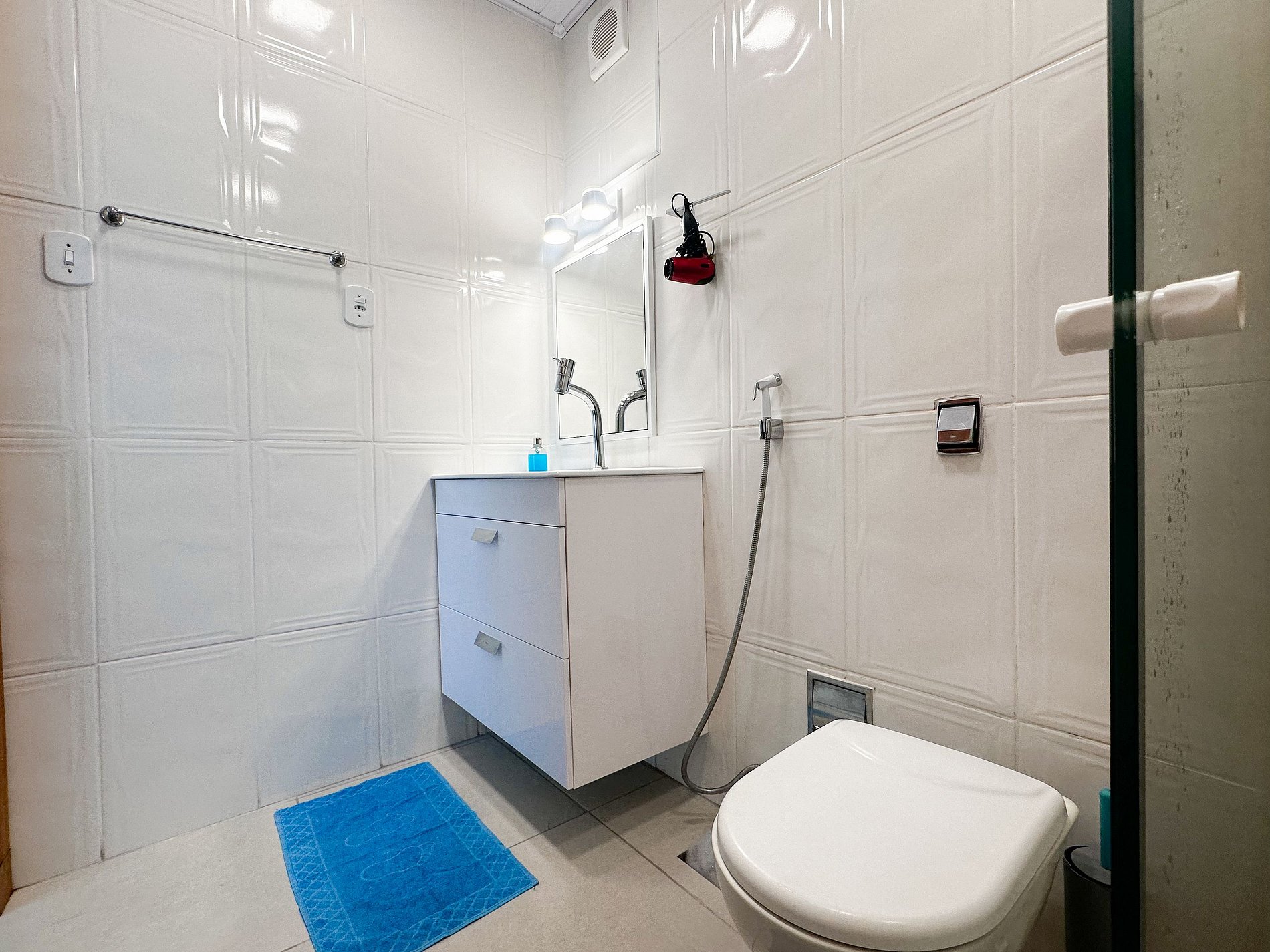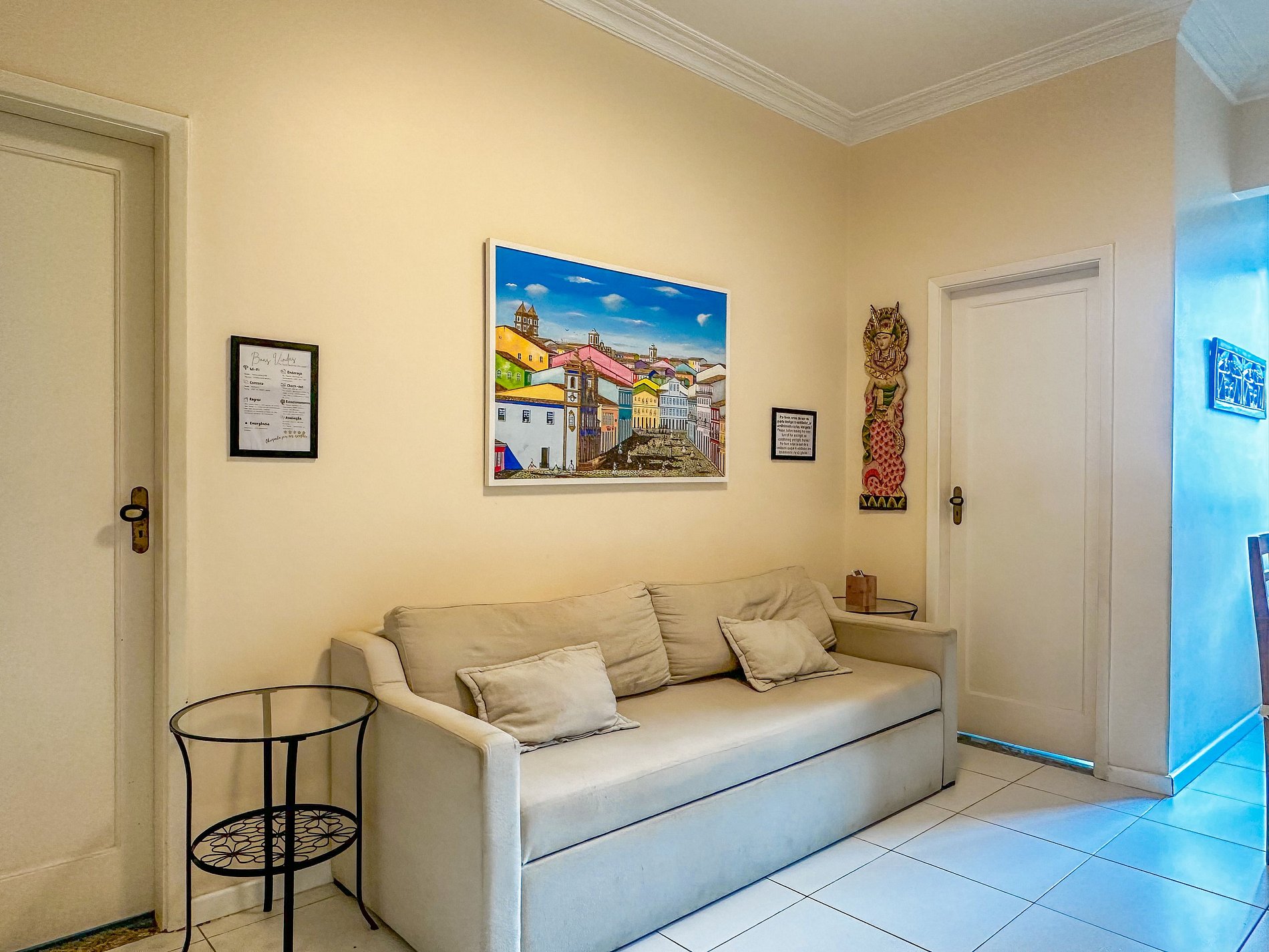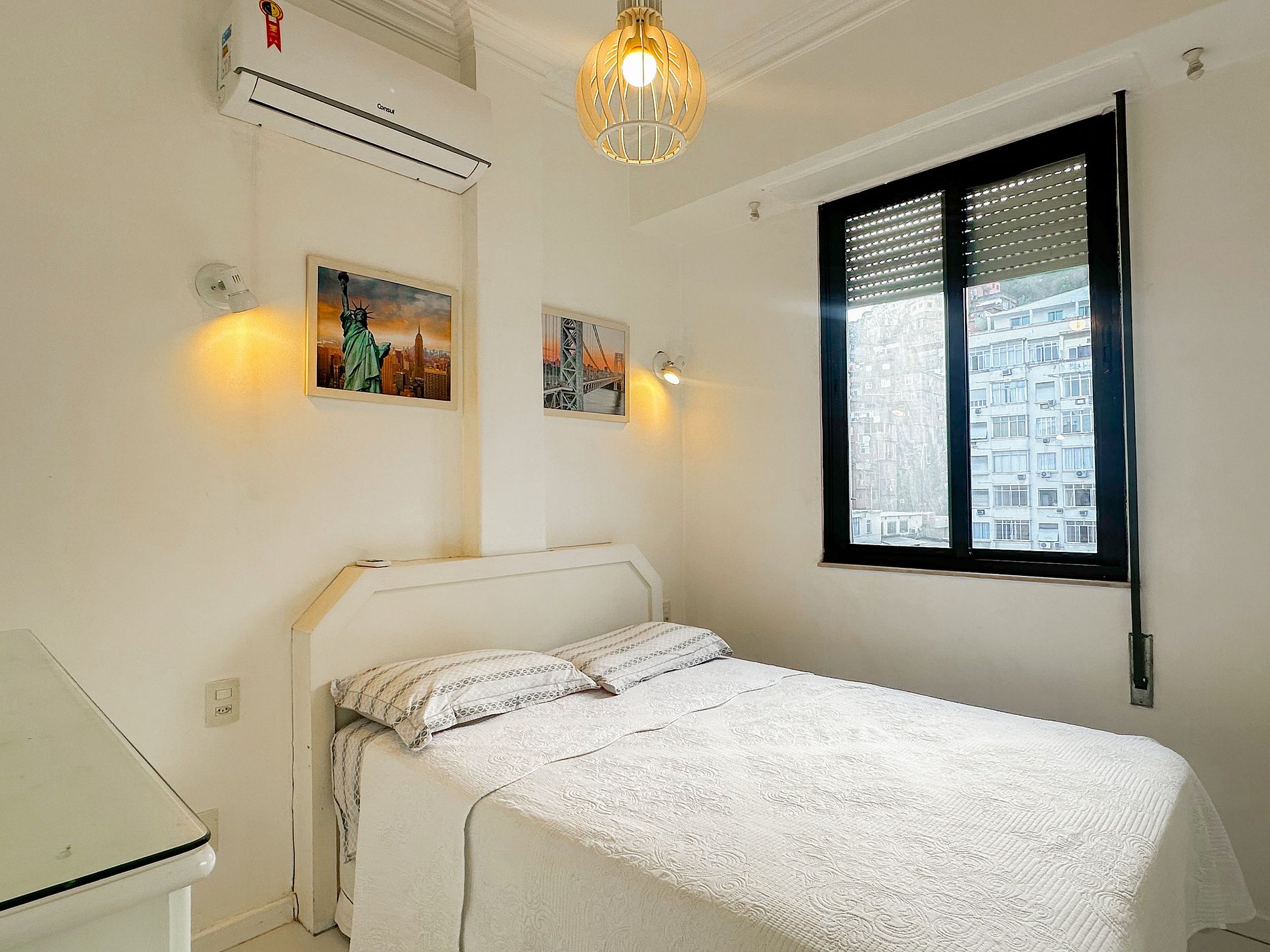 O apartamento é bem espaçoso Tem a capacidade para até 6 pessoas. Está a 200m da praia de Copacabana. Tv smart 50’ na sala No quarto Tv smart 43’ Mesa com 6 cadeiras na sala Sala com sofá cama casal Geladeira nova de inox Possui, liquidificador , sanduicheira, cafeteira e itens para cozinhar. Quartos e sala com ar condicionado split. Quartos e sala com janelas acústica ante ruidos e venezianas (black out) Possui banheiro social completo e uma suíte Área de serviçoInternet de 250megas e Tv a cabo