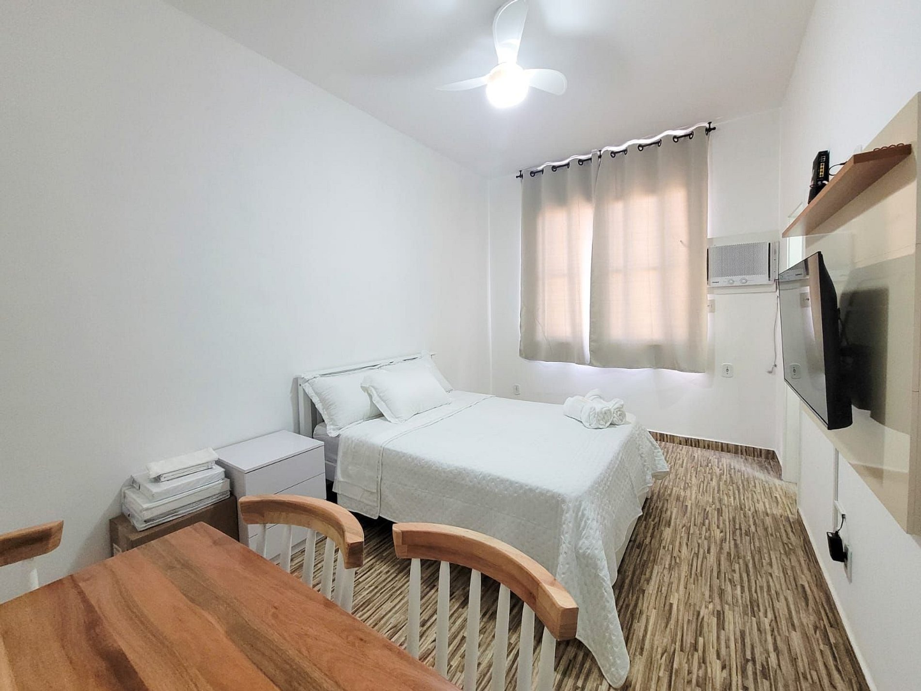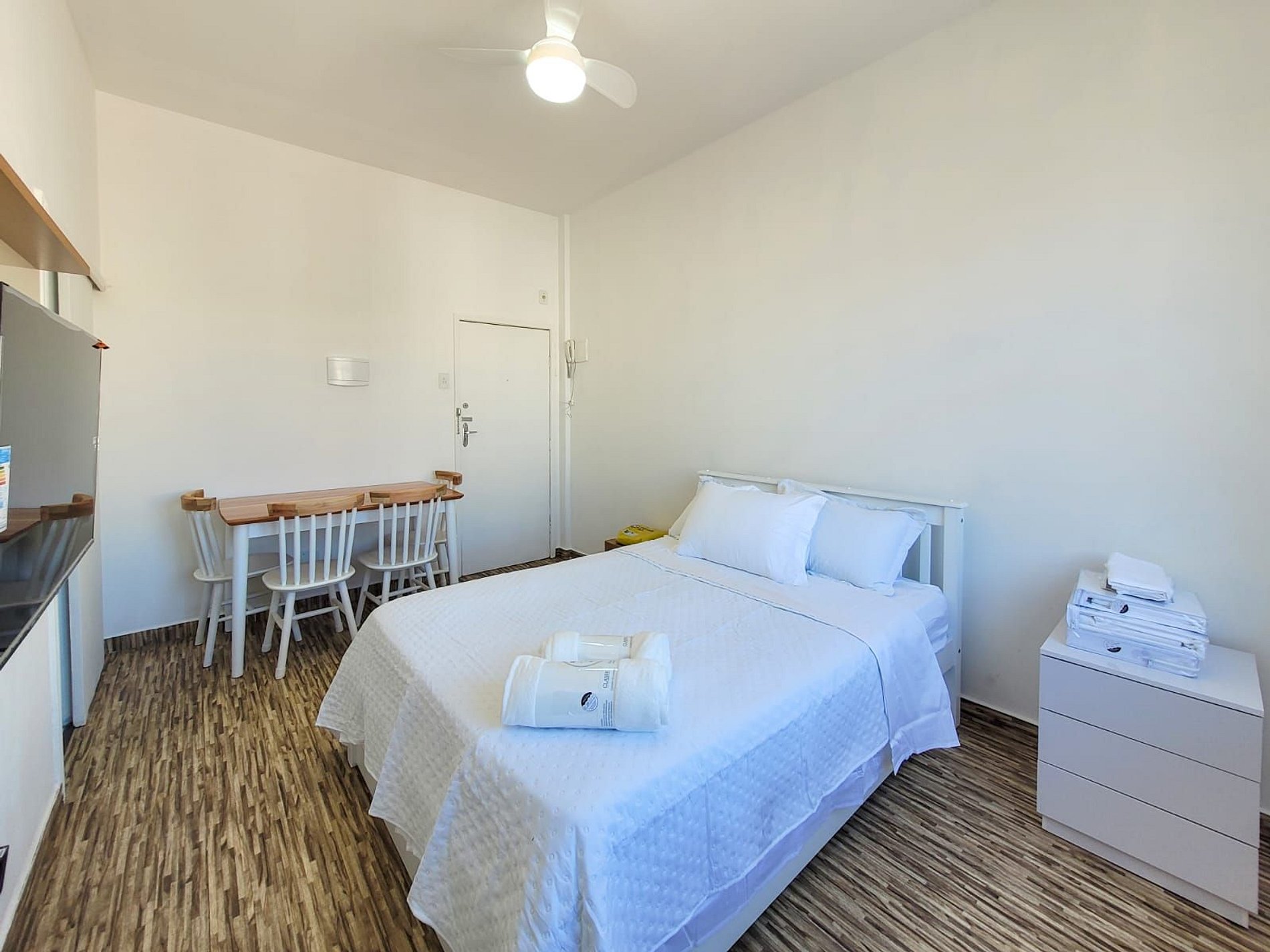 O espaço inclui uma cama, uma mesa com quatro cadeiras e todos os móveis novos. Este é um espaço confortável e iluminado, projetado para praticidade e conforto.