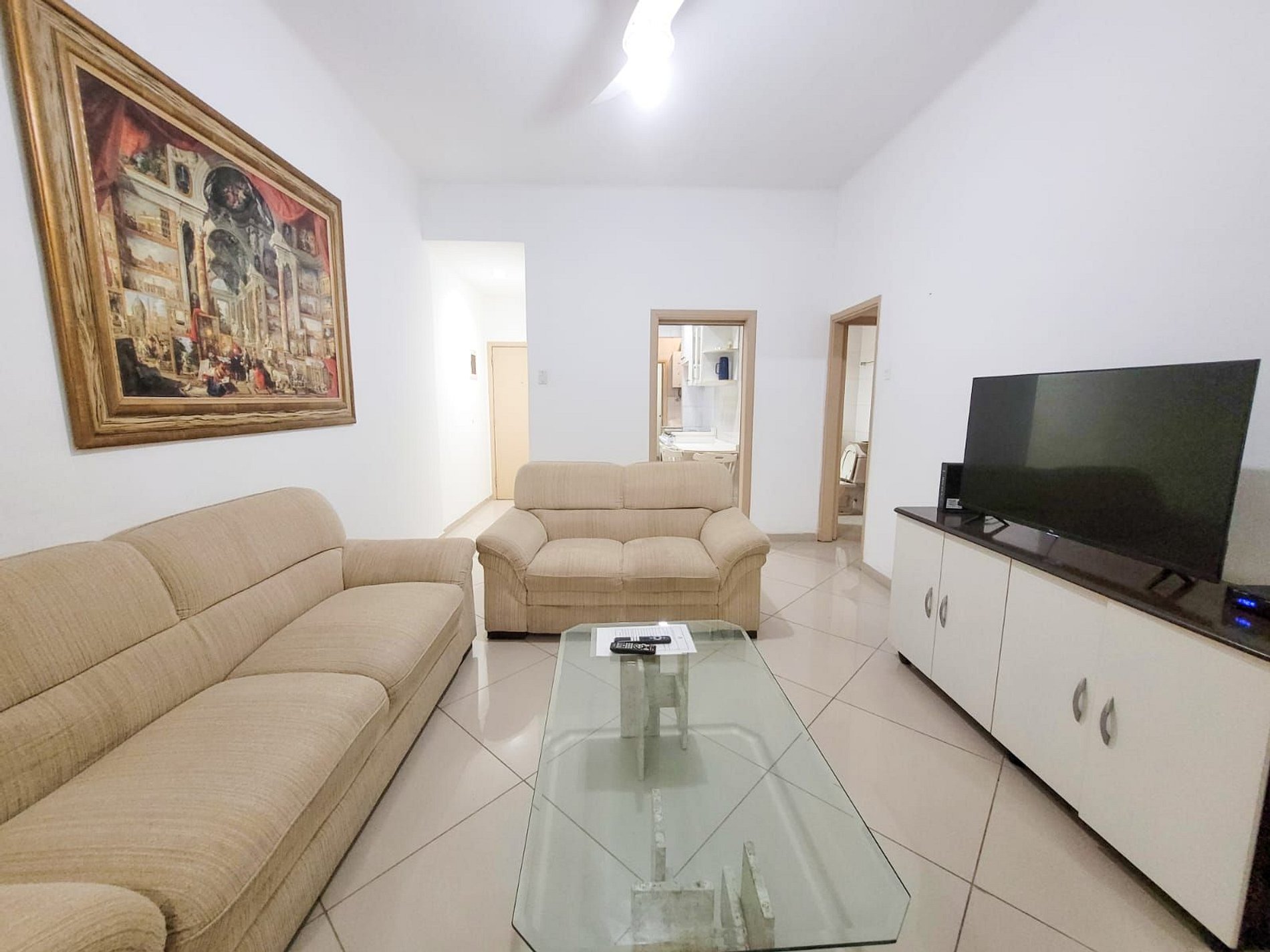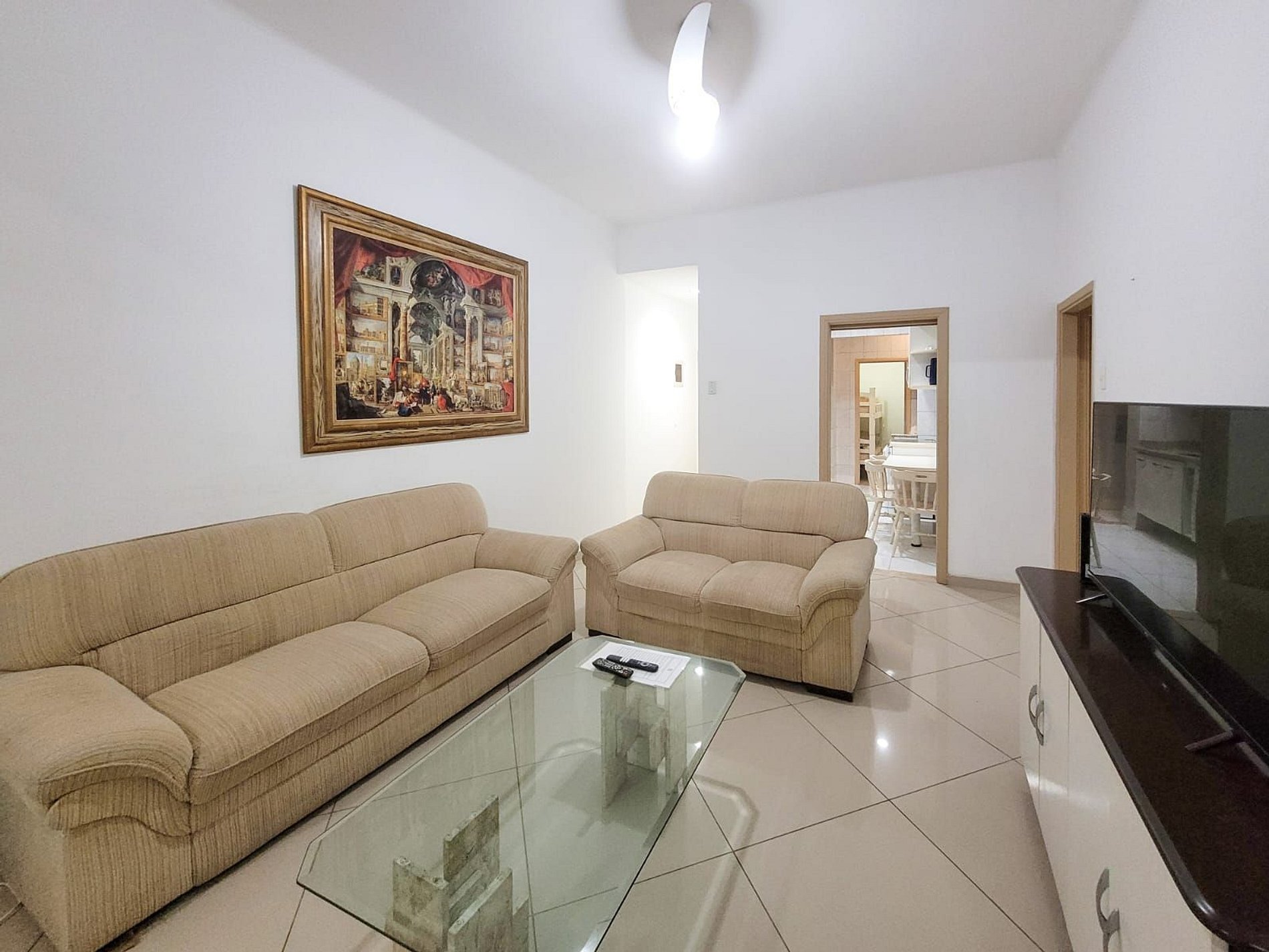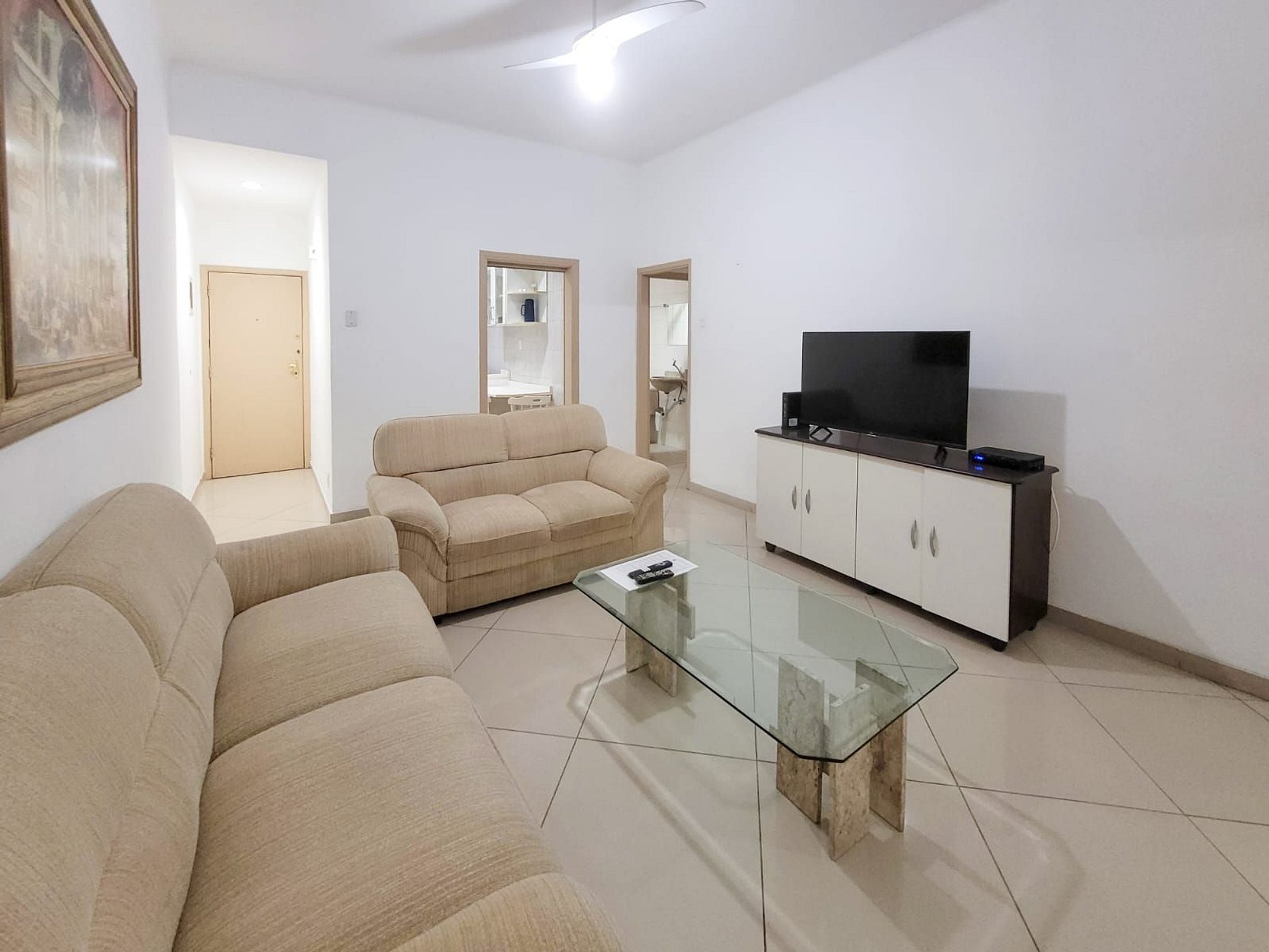 O apartamento oferece uma sala ampla e aconchegante, perfeita para relaxar depois de um dia de praia, além de uma cozinha completa, equipada com todos os utensílios e eletrodomésticos necessários.