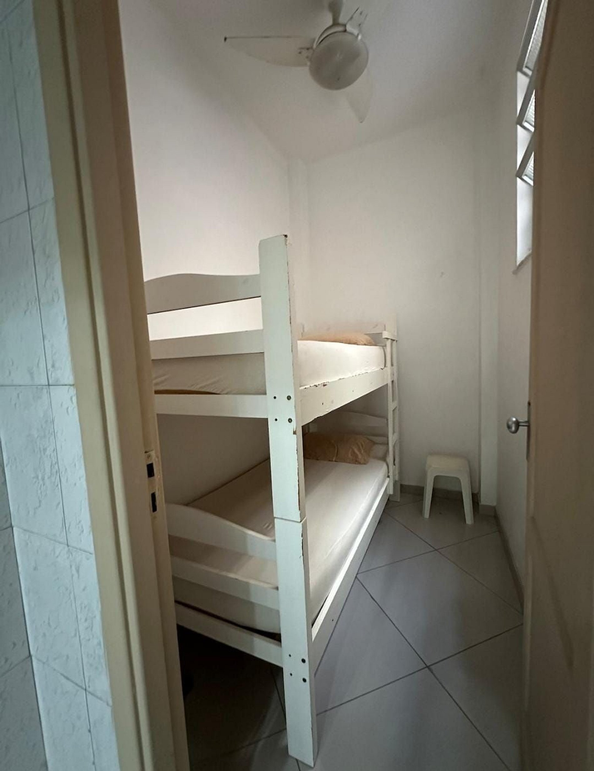 Terceiro quarto com beliche e ventilador, ideal para crianças ou acompanhantes.